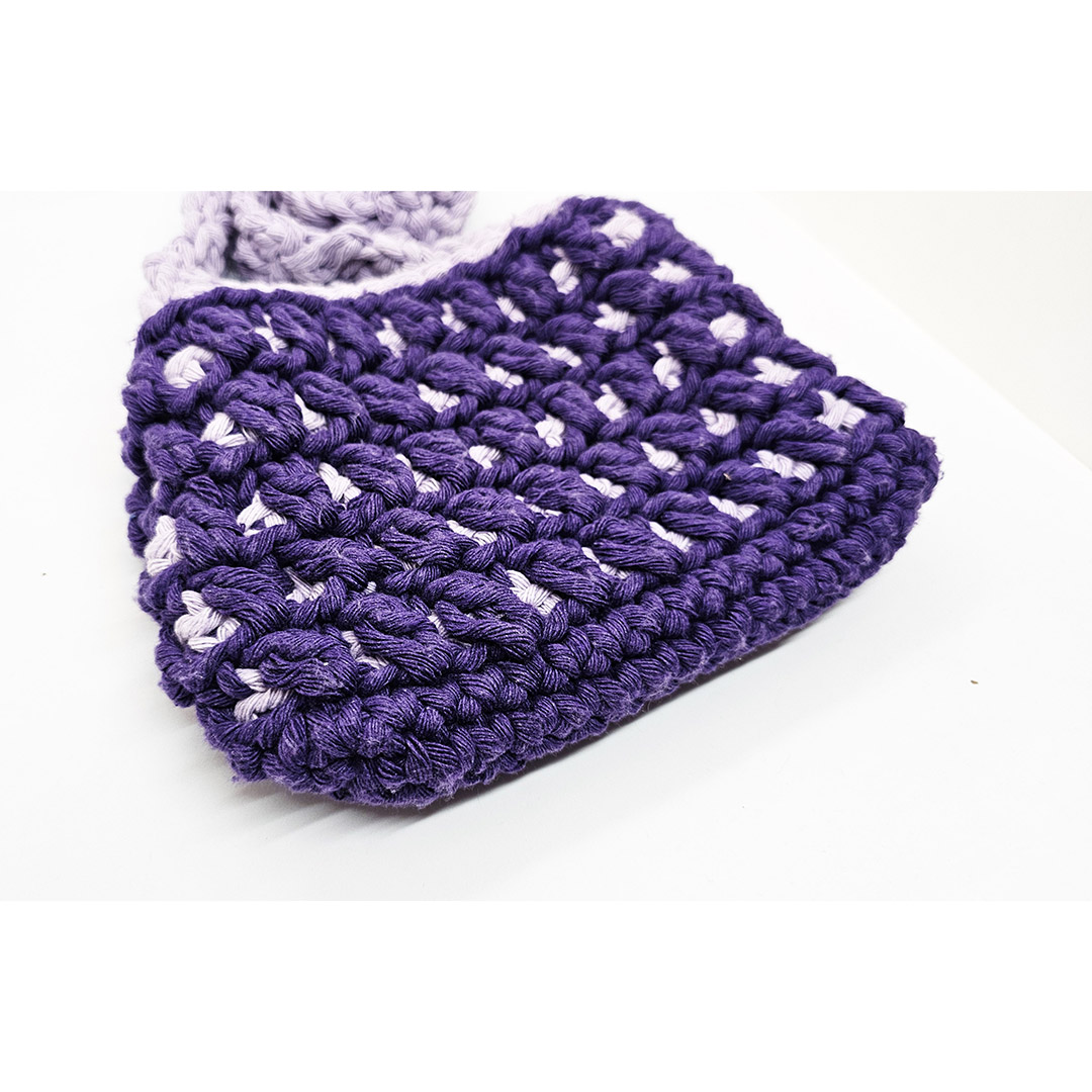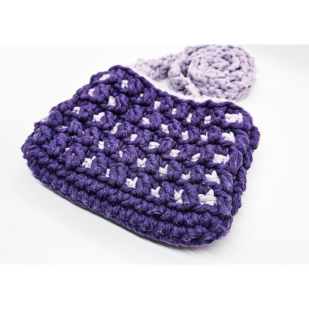 Ta urocza szydełkowa torebka w odcieniach jasnego i ciemnego fioletu to idealne połączenie stylu, funkcjonalności i rękodzielniczego kunsztu. Wykonana ręcznie z miękkiej, przyjemnej w dotyku włóczki, zachwyca starannością wykonania i delikatnym przejściem kolorów.